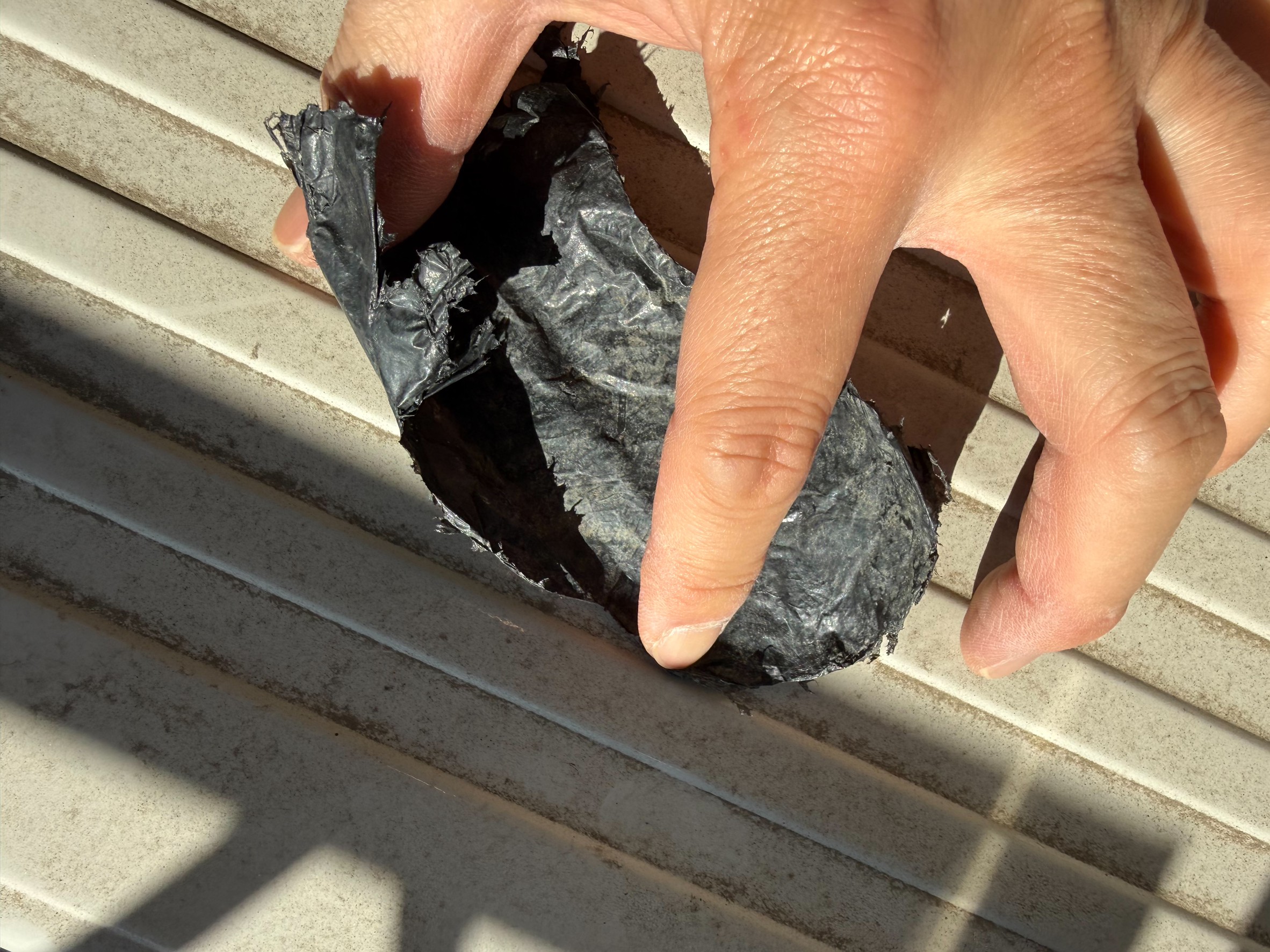 確認してみれば、風で飛ばされてきたと思われる黒いビニール片が室外機に挟まっている状態でした。